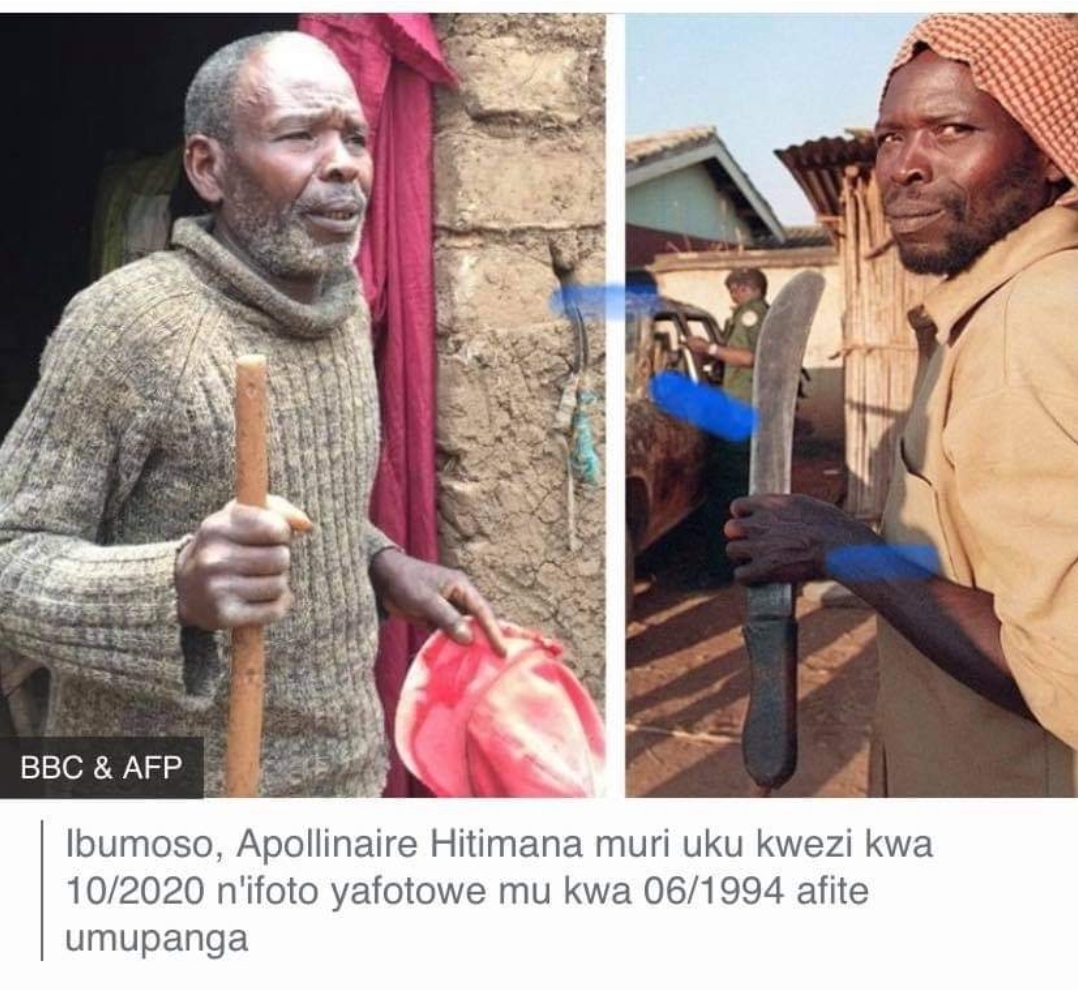 Regardez les deux photos ci-bàs. À gauche, c’est la photo d’un rwandais, Apollinaire Hitimana, 68 ans, prise octobre 2020. À droite, c’est le même homme, Apollinaire Hitimana, 42 ans, prise juin 1994. Cette dernière photo avec la machette à la main est la photo qui est exposée à Kigali Genocide Memorial pour représenter un génocidaire. Avertissement de la plus haute importance: Mr. Hitimana n’est pas génocidaire, il était même parmi les personnes intègres choisi pour diriger les procès Gacaca tel que mentionné dans cette article de BBC en Kinyarwanda. Cette photo a été prise par Alexander Joe de l’AFP qui était avec les militaires du FPR qui ont demandé à Mr. Hitimana de poser avec la machette à la main (lire l’article de BBC).