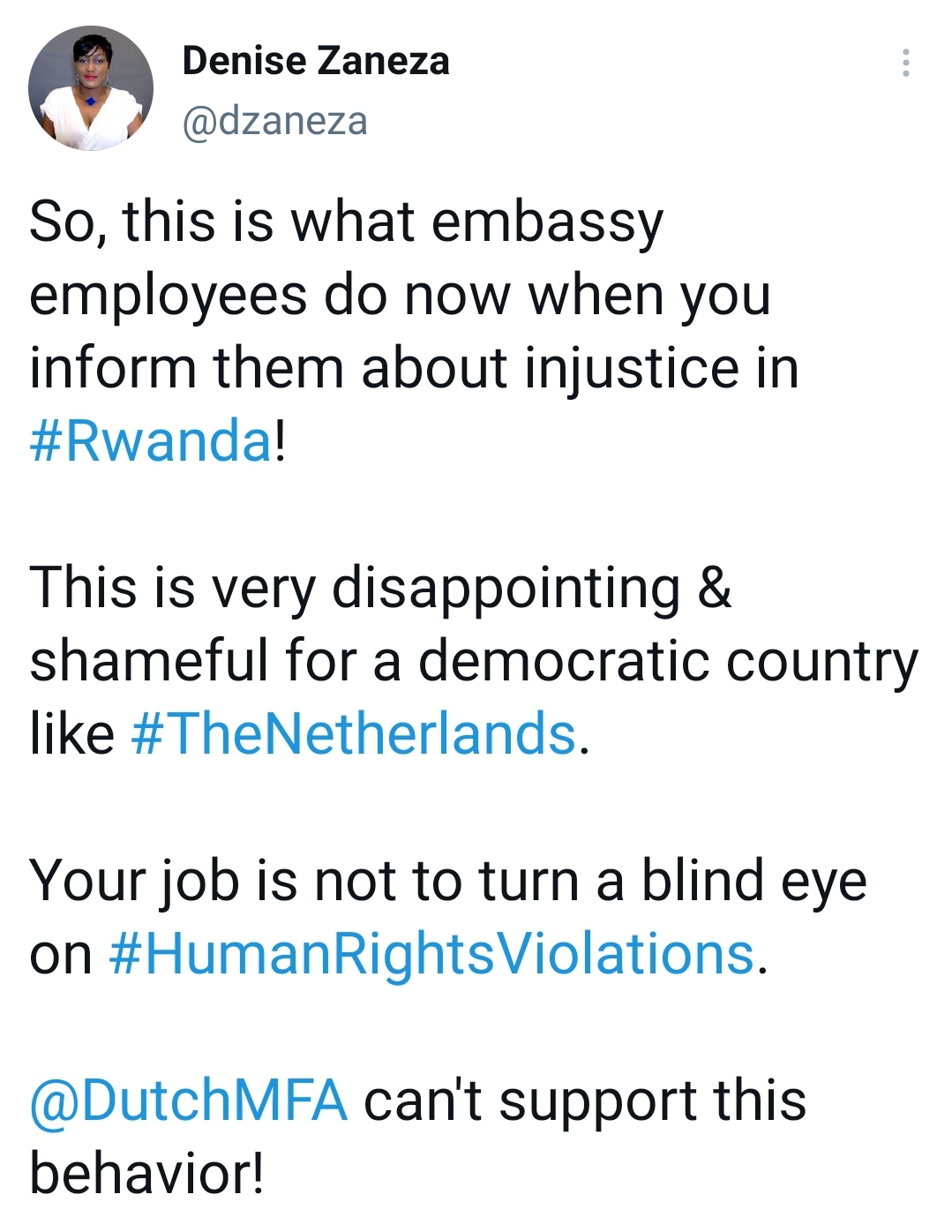 Je reste convaincue que les difficultés politiques, sociales et économiques auxquelles mon pays est confronté ne peuvent être surmontées que si notre gouvernement est contraint de faire les réformes de gouvernance nécessaires aujourd’hui. Ces réformes peuvent être réalisées à travers un dialogue entre toutes les composantes de la société rwandaise[5].