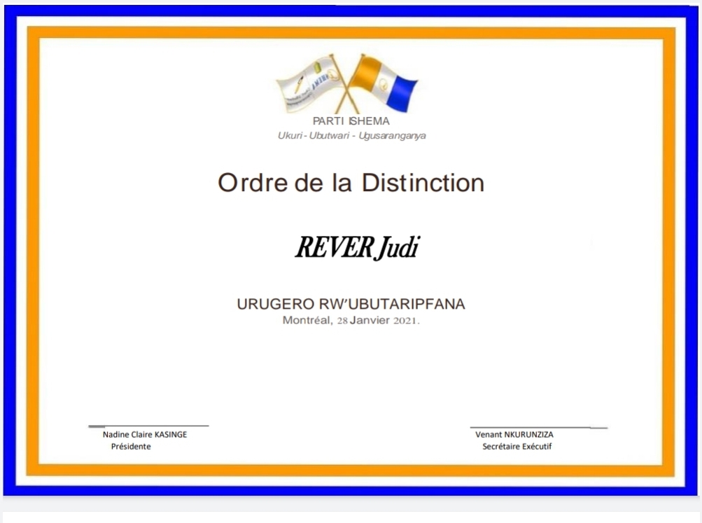 - Guhatanira ubuyobozi bw’igihugu mu matora yose. Dutoye kandi tweretse rubanda Umukandida uzahagararira Ishyaka Ishema mu matora y’Umukuru w’igihuguku azaba mu mwaka wa 2024, ari we Madame NADINE Claire KASINGE.
